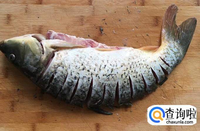 鲜活的鲤鱼一条约1000克,宰杀后刮去鱼鳞去除内脏和鱼腮清洗干净。靠近鱼头和鱼尾处各切一刀抽出鱼腥线,为了使鱼肉更好的入味儿把鱼脊肉厚处改花刀。