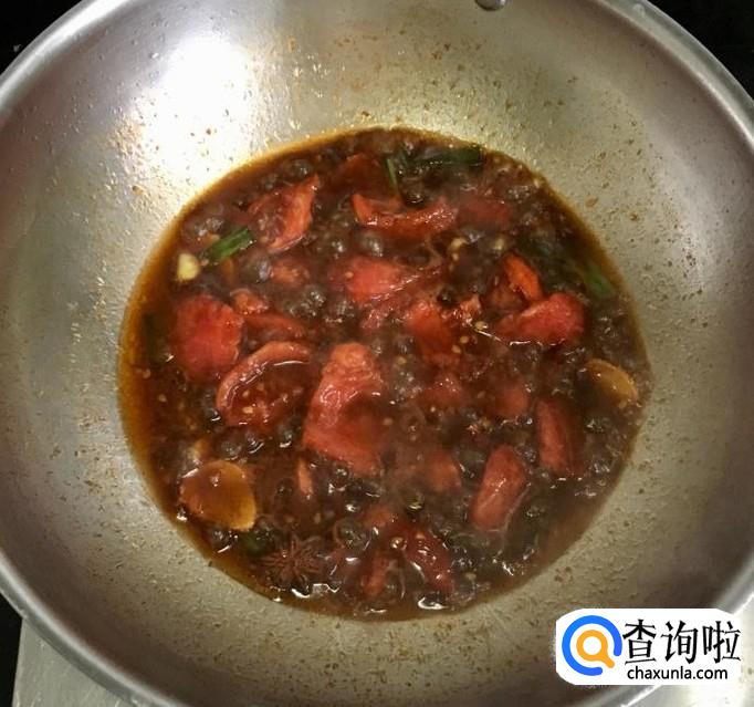 热锅加入适量的花生油把葱段、姜片、蒜片、八角、花椒爆香,料酒、生抽、香醋烹锅,加一点白糖放入番茄块翻炒至出汤汁
