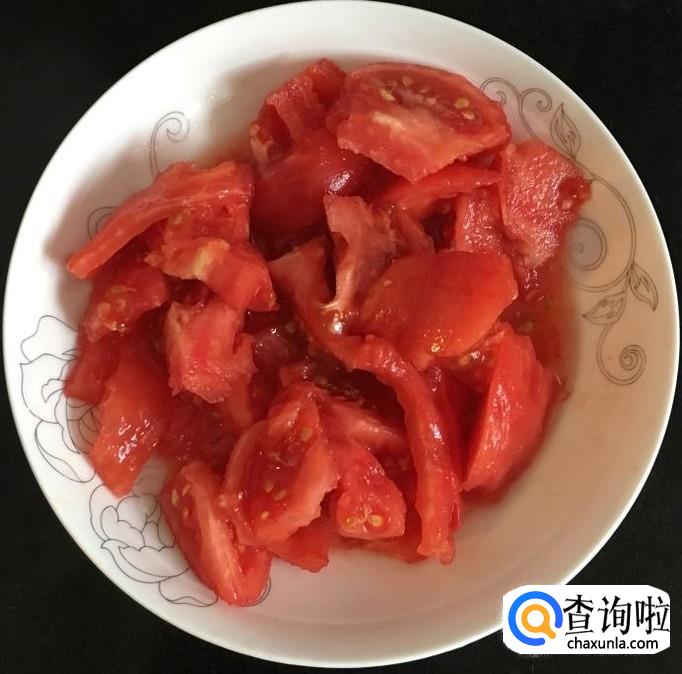 大番茄一个清洗干净剥去外皮切成小块,青红椒洗净切丝备好