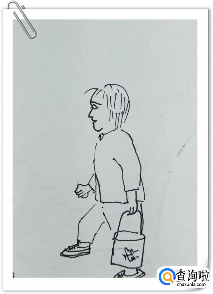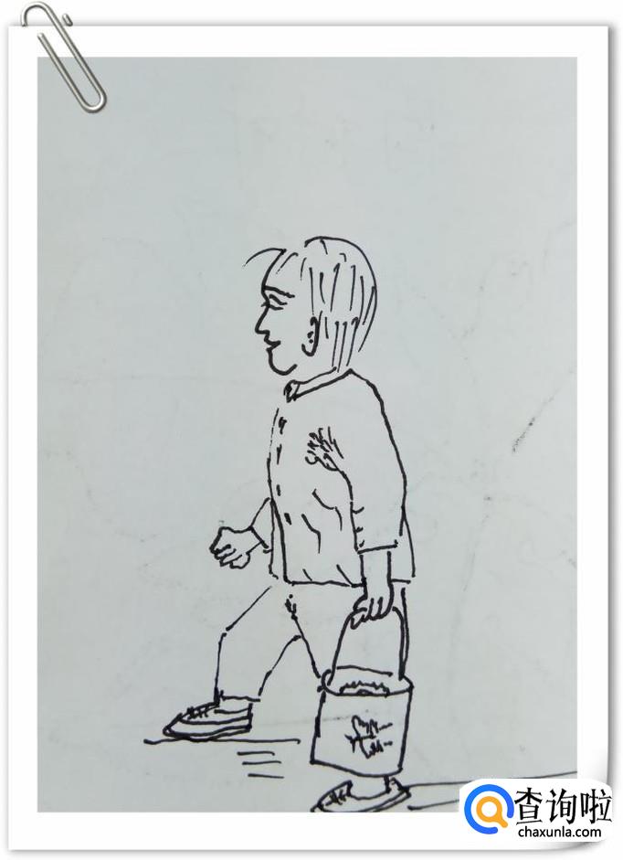再用一些小线条画出衣服上的褶皱,再画一些长短不一的线条,画出地面。再用一些曲线,画出水桶里的水,水装得非常满,要很小心才可以不洒出来。