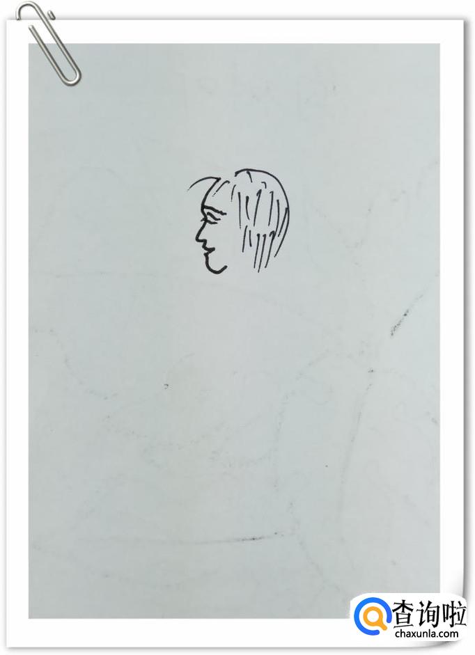 在白纸上用曲线画出一个女孩儿的头部,这是一个侧脸,重点画出眼睛,嘴巴,鼻子,还有一些小的短线条,画出她的头发。