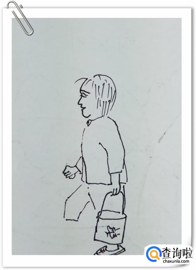 用曲线,弧线,椭圆形等,画出这个女孩的上半身还有手里提着的水桶,重点刻画出女孩两只手的细节,你看她一只手用力的提着水桶,另外一只手攥着拳头,在使劲呢。