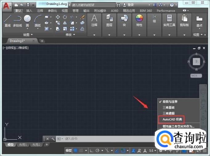 点击切换工作空间选项在其内找到autoCAD经典选项,如图所示: