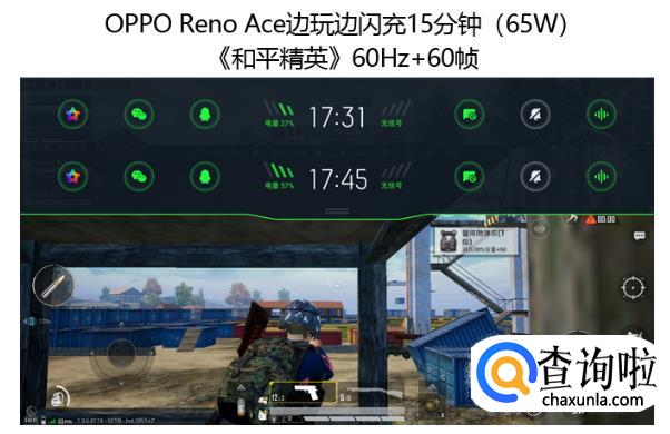 实际的效果也让我们相当惊喜,无论是90Hz+60帧还是60Hz+60帧模式,OPPO Reno Ace维持上边续航测试的设定,边玩《和平精英》边闪充15分钟均充入了30%的电量。