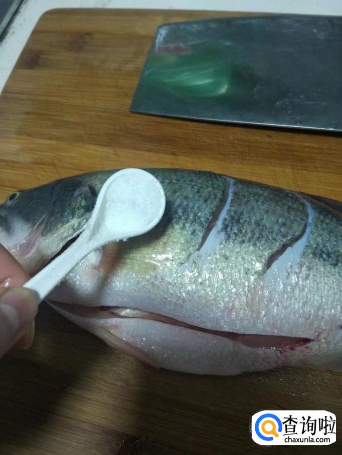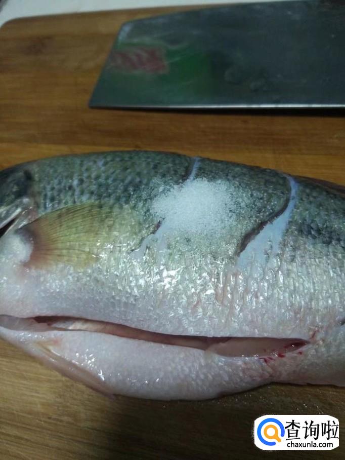在鲈鱼身上撒上食盐并且涂抹均匀,并且加入料酒,腌制15分钟