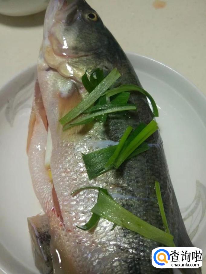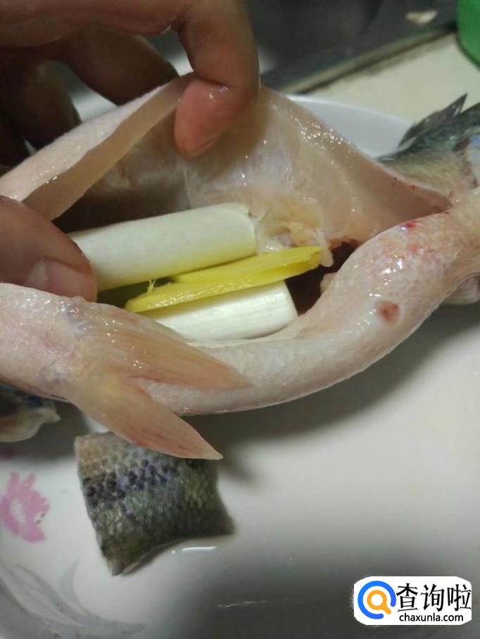 把葱段和姜片塞进鲈鱼肚子里