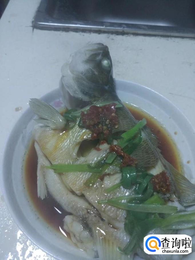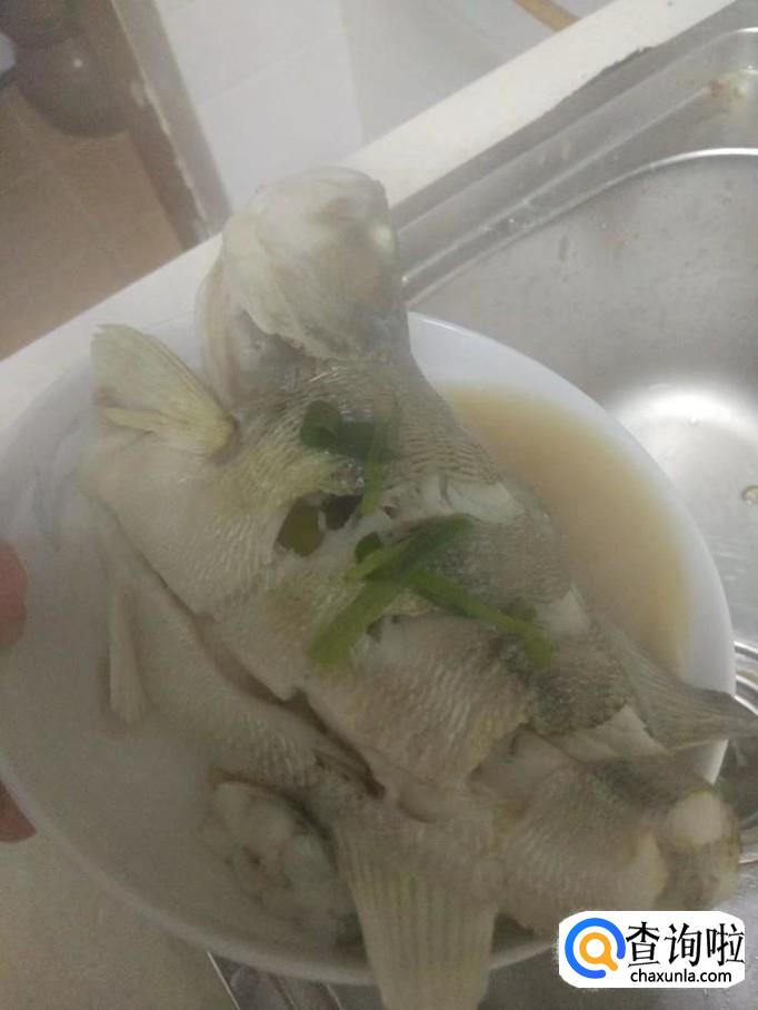 从锅内取出蒸好的鲈鱼,倒掉多余的水分