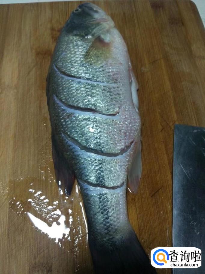 鲈鱼两面都进行斜刀切,为了更好的入味和更快蒸熟鲈鱼