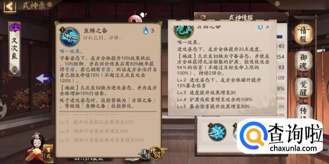 大招就是一个奶+拉条的效果了,上一个能奶能拉条的式神还是蜜桃。技能描述里说到一定条件下可以治疗队友15%的生命值,要知道椒图的链子回血才5%,这个数值还是很大的。大招也是根据两种状态来切换技能的,“鱼鳞之备”可以奶,“方圆之备”可以用来拉条,想用哪个技能切换式神的状态。大招切换状态的时候会有独特的效果,方圆切换鱼鳞可以得到一个不能被驱散的盾,而且盾很厚保证不被打死,方圆之备还可以提升队友的暴击伤害,这一个式神所带来的作用太多了。技能点只有普攻和大招用升级,加满最好,每一个都用的到。