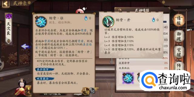 1、破势:破势作为大多数输出式神的首选御魂,效果还是非常不错的,因为久次良自带暴击效果,配合破势和双重暴击,伤害简直爆炸。
