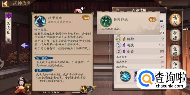 再来看久次良的被动技能,没有被久次良骨盾保护的式神受到攻击,久次良会反击敌方目标,并且再次给友方护盾。一个类似于犬神的技能,还有几率进行协同补刀,依旧是依靠普攻来输出。