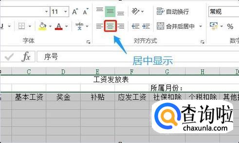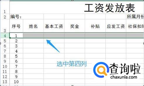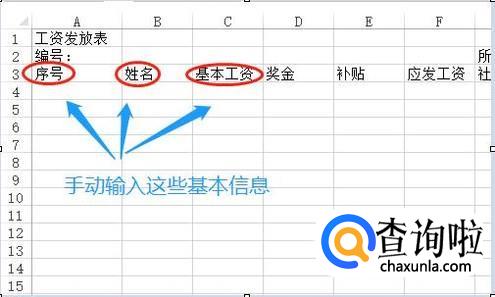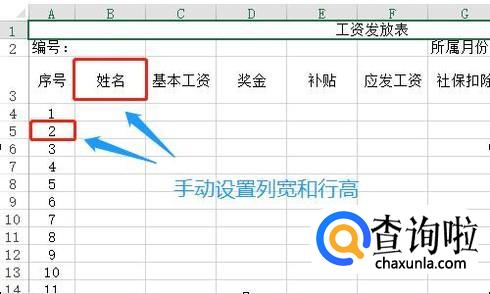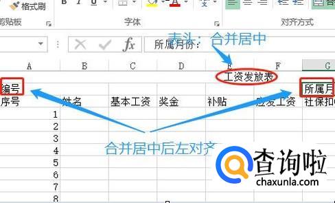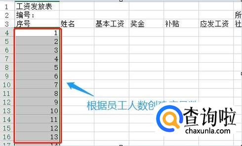 然后在序号下方创建序号,有多少员工就创建几行,接下来就是调整刚才每个单元格文字的大小以及文字的位置了,比如最上面的"工资发放表"这几个字就应该合并居中,而下方的编号和所属月份因为和下面的有对应关系,所以需要居中合并以后在左对齐,如图所示