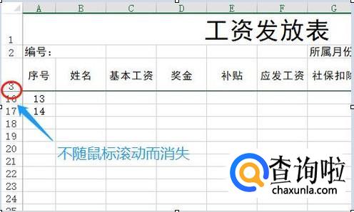在冻结窗口下方点击"冻结拆分窗口",然后我们再往下滚动窗口的时候,就会发现前三列固定不动了,这样便于我们对照员工信息,如图所示