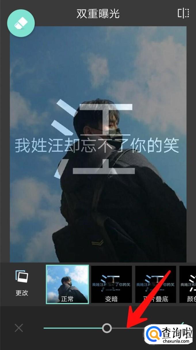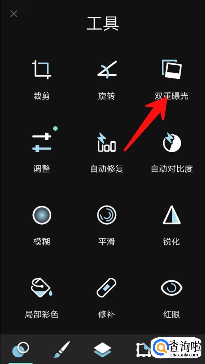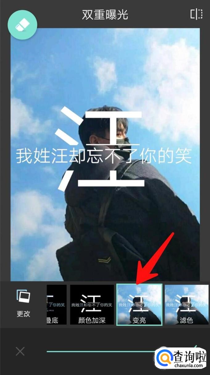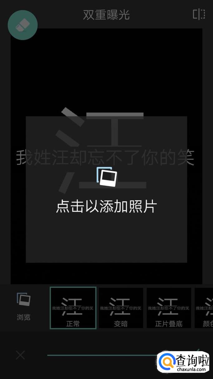 点击左下角的图标按钮后,可以看到很多选项,然后点击“双重曝光”,再添加一张背景图,背景图就选自己喜欢的啦,不过不要选择太暗的哦。