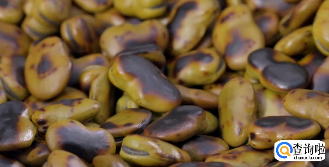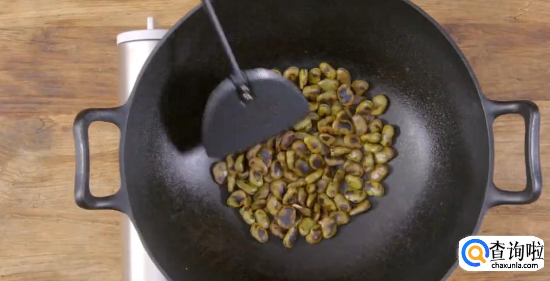 将蚕豆倒入冷锅,开大火翻炒至表面焦掉,然后转小火继续翻炒至图中色泽。