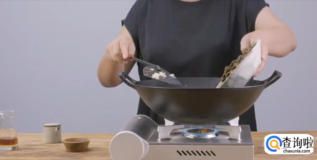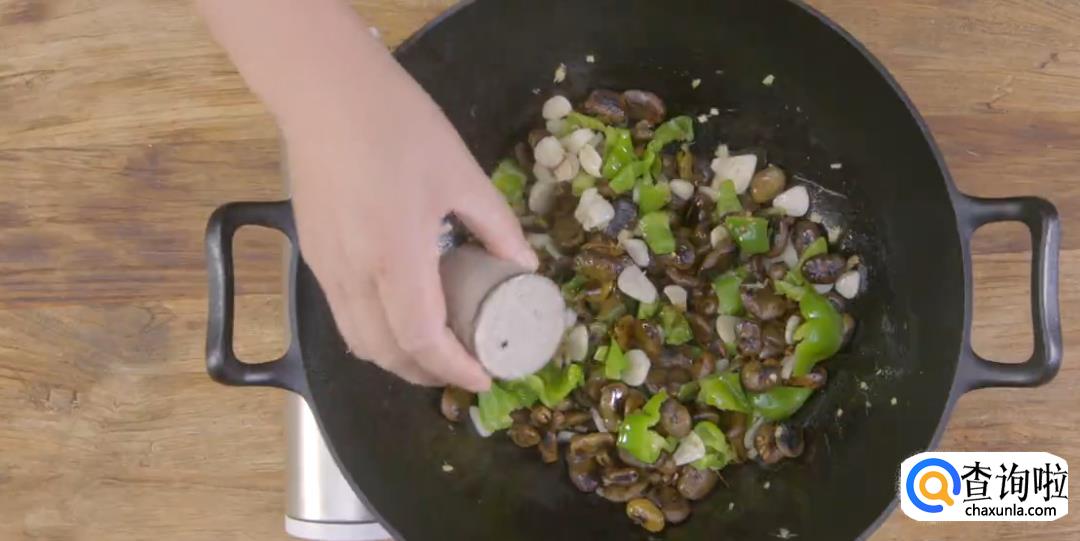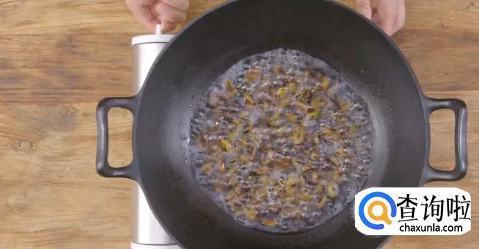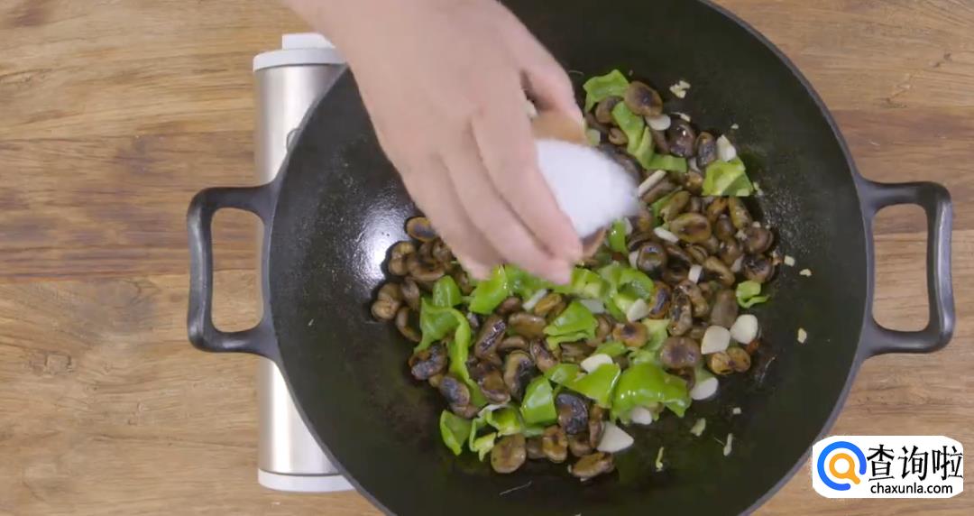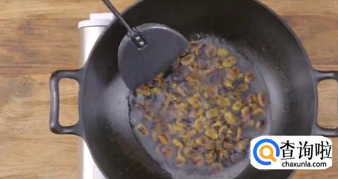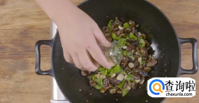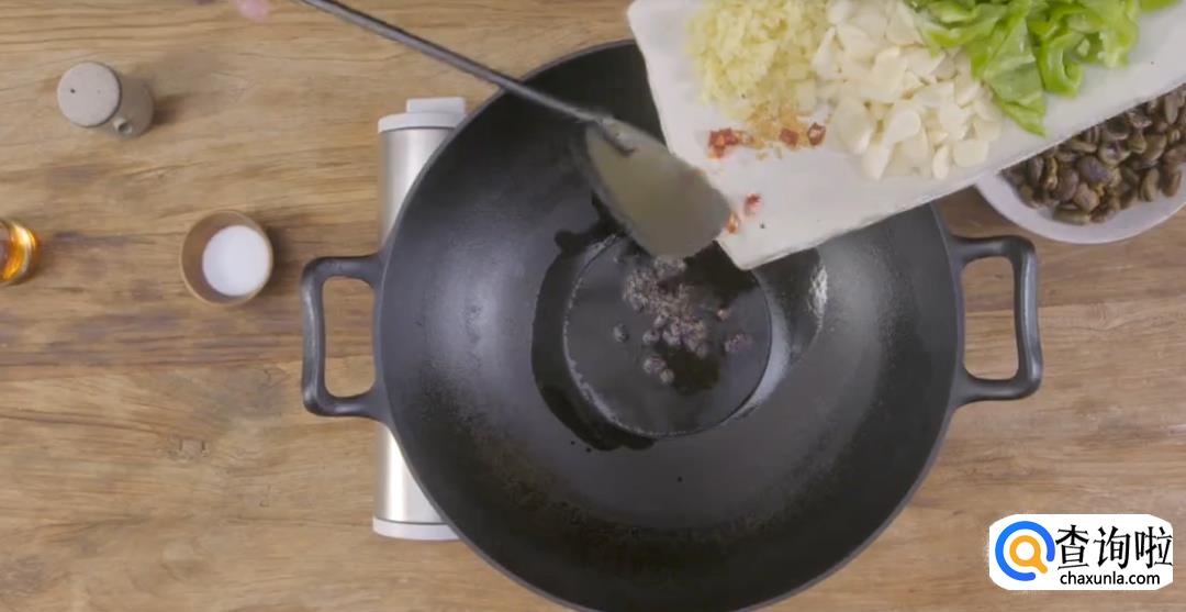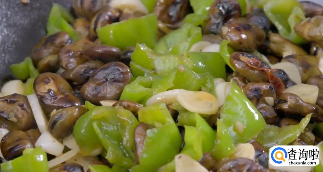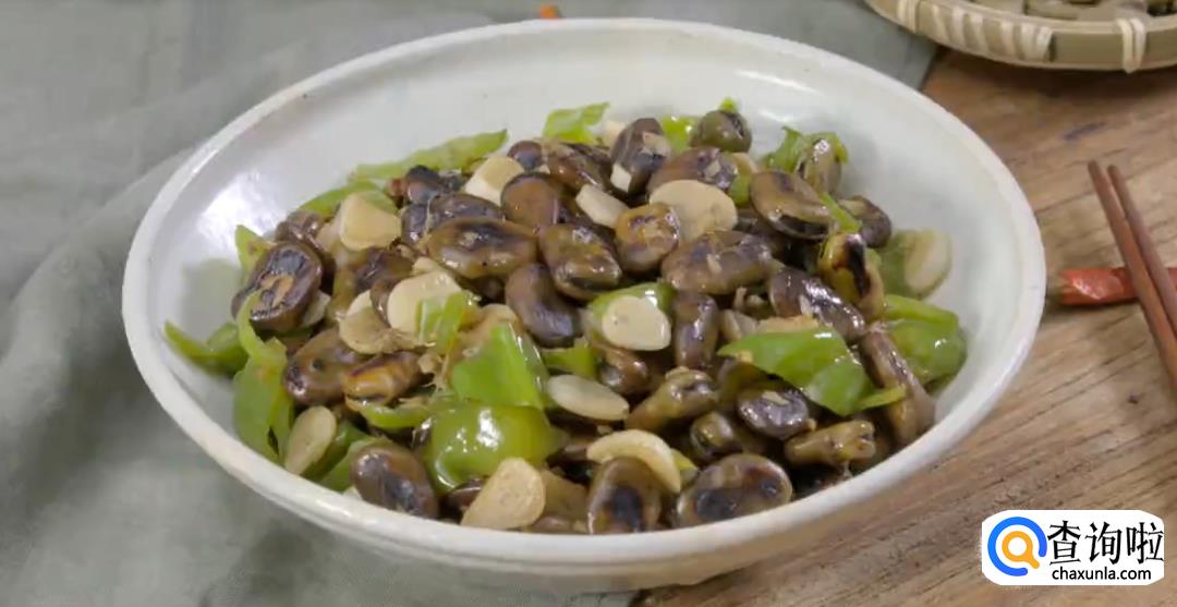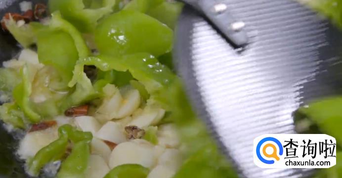将干辣椒,姜末,蒜片,青椒块下锅翻炒,再倒入泡好的蚕豆。