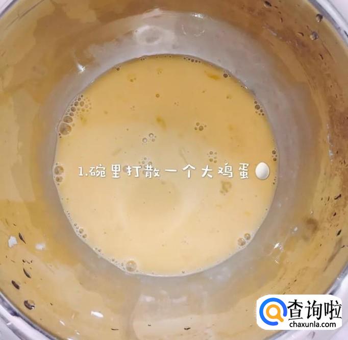 首先在一个碗内打入一颗鸡蛋并打散,如下图所示。