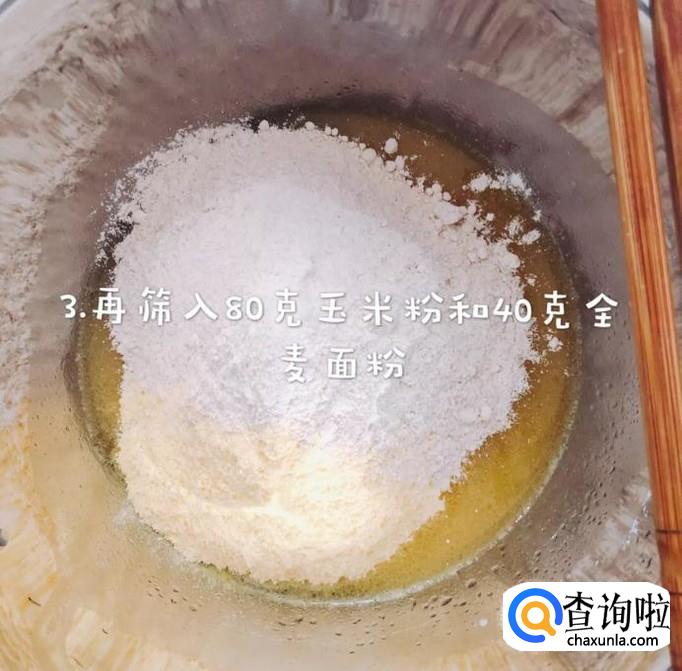然后筛入80克的玉米粉和40克的全麦面粉,如下图所示。