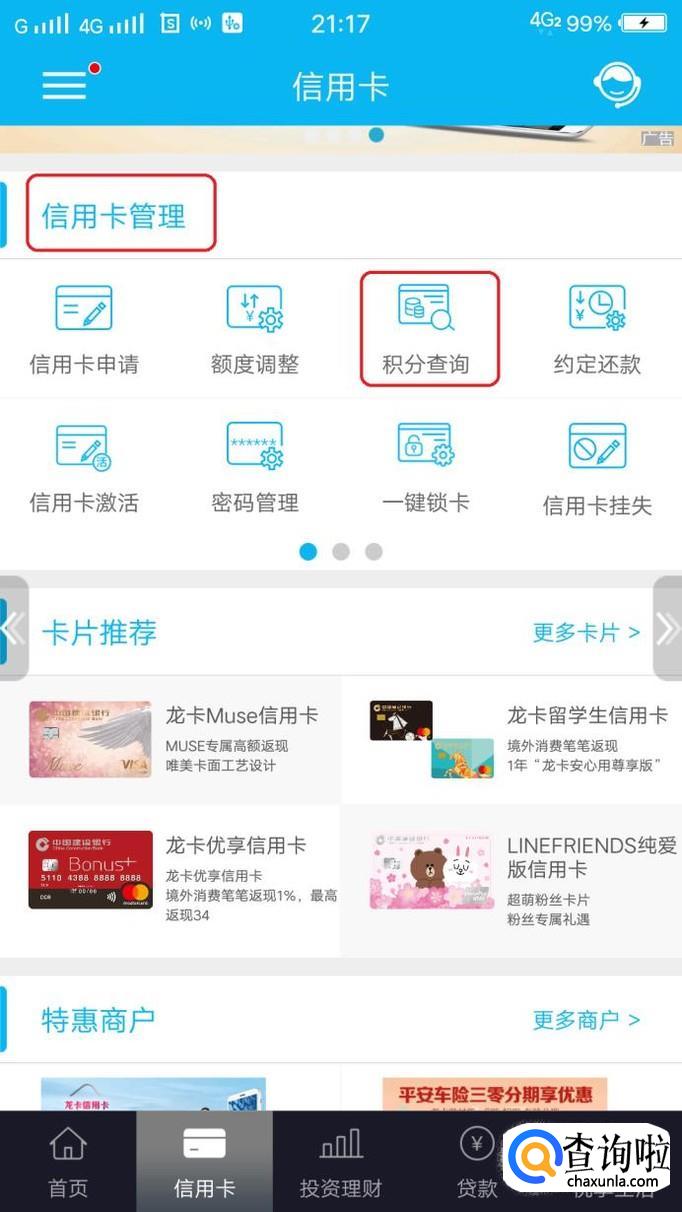 往下划动页面,就可以看到在“信用卡管理”栏下,有“积分查询”图标,点击一下。