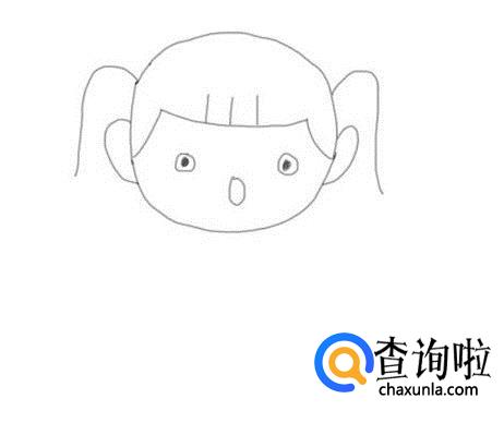 首先画出小女孩的头部,在头部上画出小女孩的两只耳朵和头发,然后再在头部上画出小女孩的两只眼睛,并在眼睛下面画出小女孩的嘴巴,如图所示:
