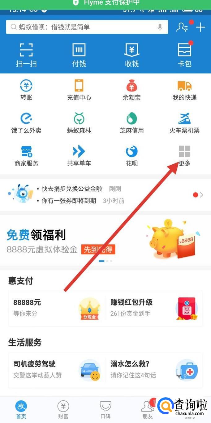 在支付宝的“首页”点击“更多”进入下一页面。