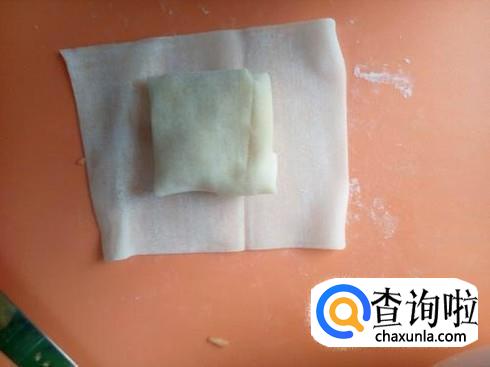 取一张混沌皮,然后把苹果快放入混沌皮中,放入适量的果酱,然后在四周涂上适量的清水,把它对折封好口