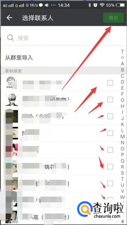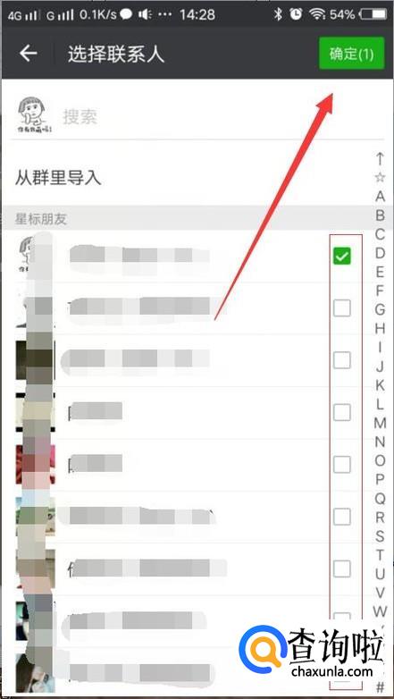 在出现的联系人右侧选择自己需要权限的好友,在后面打勾。打完勾之后点击右上角的确定。