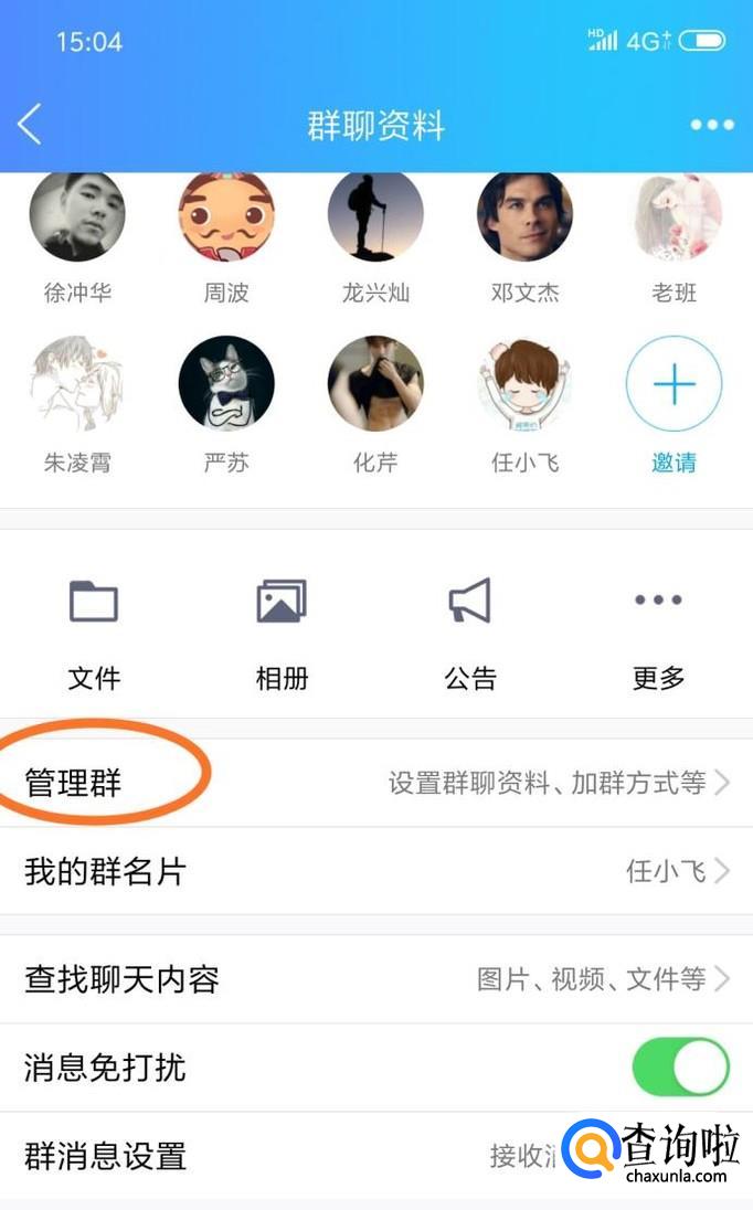 进去后,找到“管理群”选项,此选项只有当你是该群的管理员或者群主的时候才会出现。