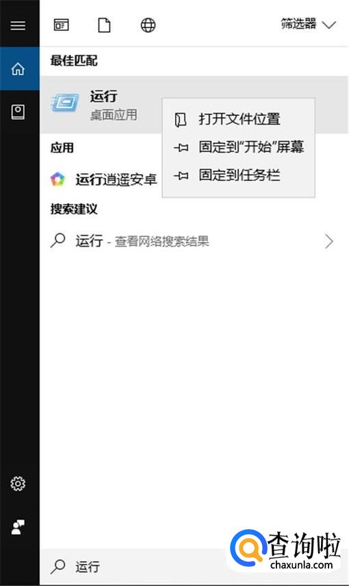 然后右键点击“运行”,选择“固定到开始屏幕”。