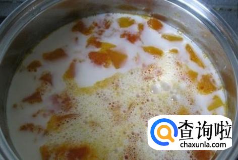木瓜这样蒸炖大概二十分钟后,打开盖子把牛奶倒进去,没过木瓜就可以蒸炖大概十分钟。
