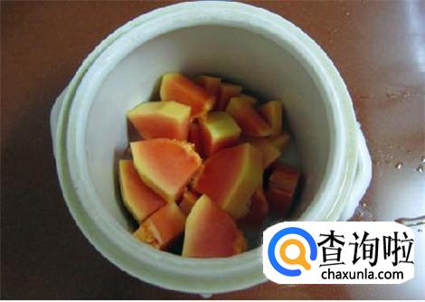 木瓜清洗一下,将木瓜的皮去掉,切开两半,将木瓜的种子也去掉。木瓜切成小块或者完成木瓜球,放进炖盅里面。