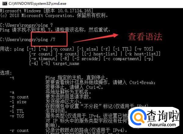 接下来我们输入如下图所示的命令来查看ping命令的基本语法规则