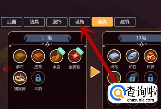 进入制作页面,选择图示位置的“设施”,点击并进入,如图所示。