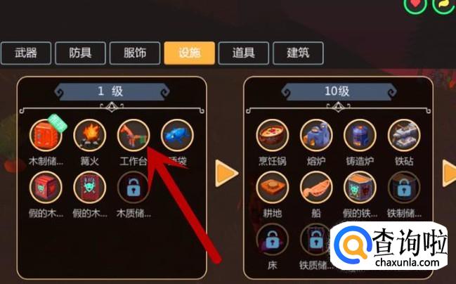 在“设施”页面,即可看到“工作台”,点击一下即可制作完成,如图所示。