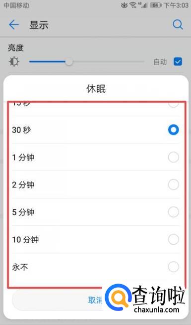 弹出的界面,我们根据我们的需求,然后点击一个时间,这样我们就设置好了自动熄屏时间了。