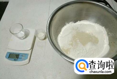 盆中加入适量的面粉,然后,将白醋与温水的混合液体倒入。