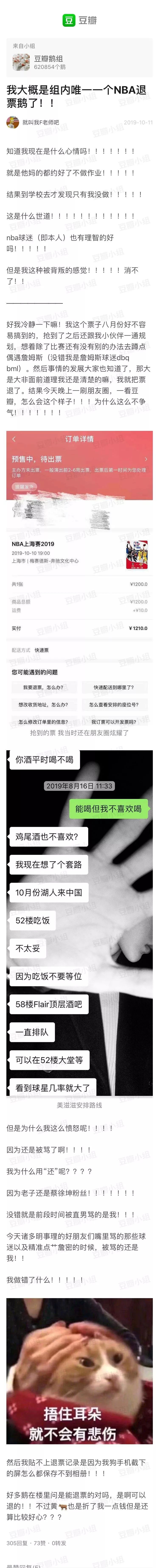 豆瓣鹅组有一个蔡徐坤和詹姆斯粉丝选择了退票