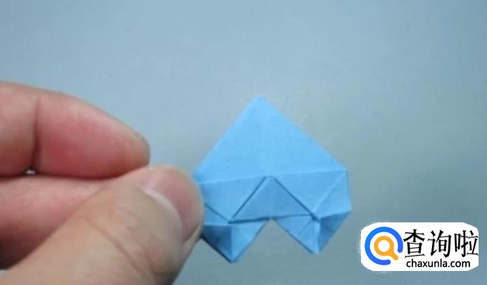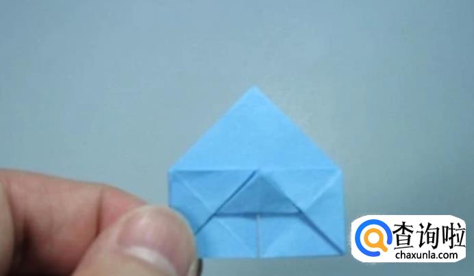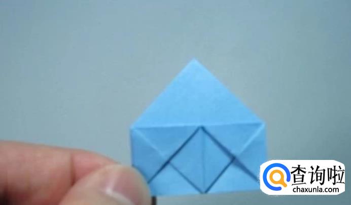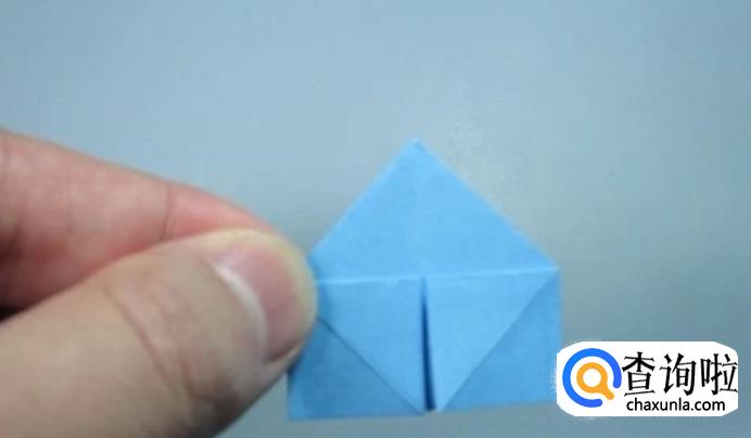 将撑开的部分用手指从上部压下来,上部中间折痕和下面中间折痕对齐。形成一个小的正方形。