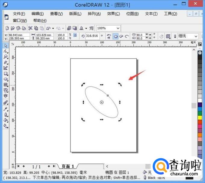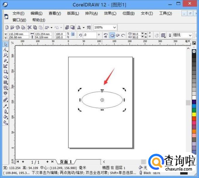 绘制好椭圆形之后双击绘制的图形,然后将鼠标移动到四角的控制点上此时我们就可以选择绘制的图形了,如图所示: