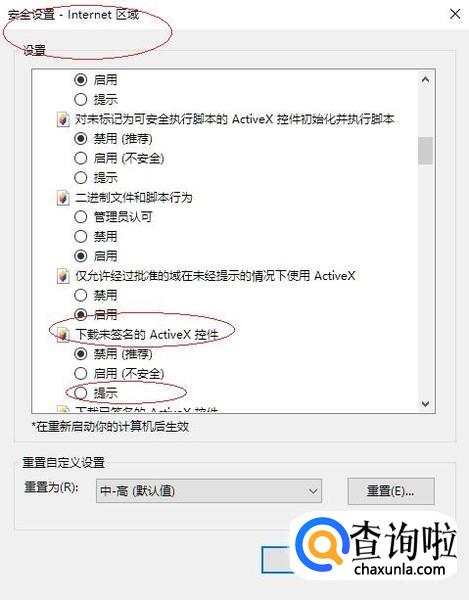 如图所示,选择"ActiveX控件和插件"选项区域。勾选"下载未签名的ActiveX控件→提示"单选框,点击"确定"按钮。