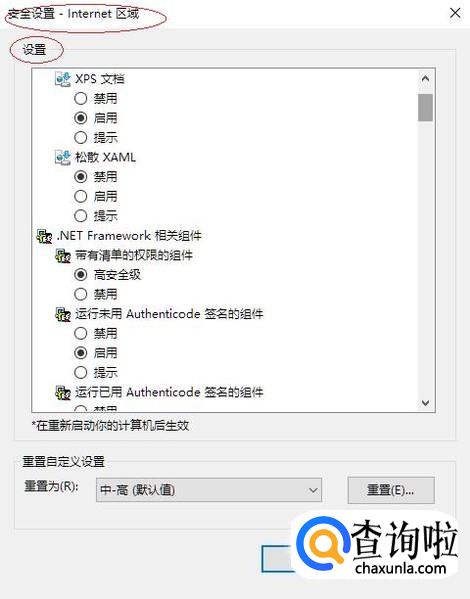 弹出"安全设置 Internet区域"对话框,如图所示。选择"设置"标签,拖动右侧垂直滚动条。