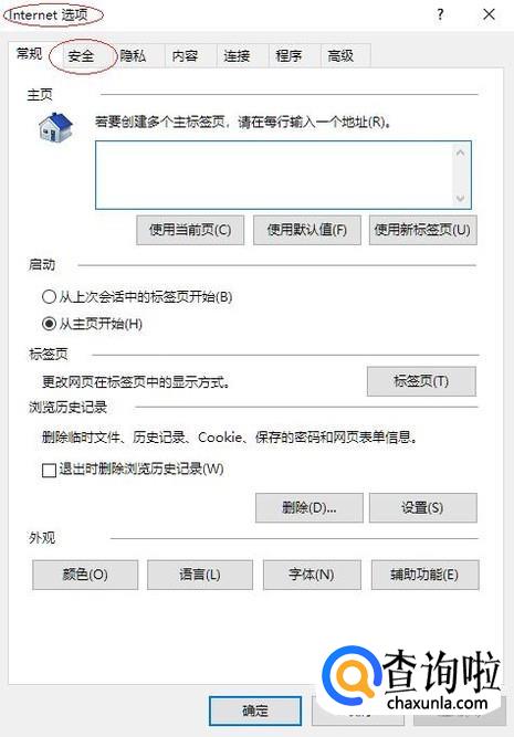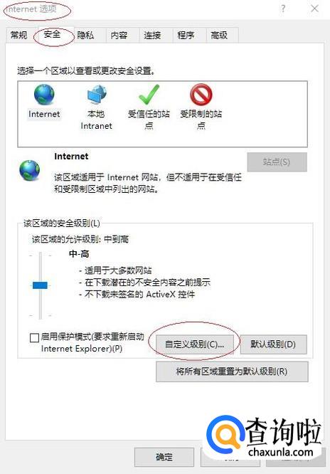 如图所示,唤出"安全"选项。选择"该区域的安全级别"选项区域,点击"自定义级别..."按钮。