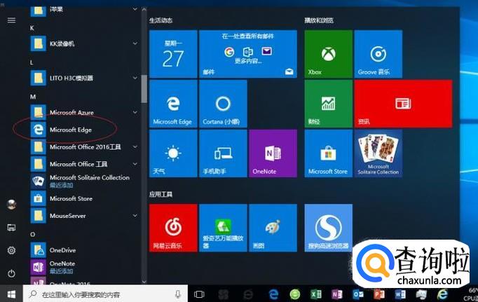 启动Windows 10操作系统,如图所示。点击任务栏"开始"按钮,选择"Microsoft Edge"项。