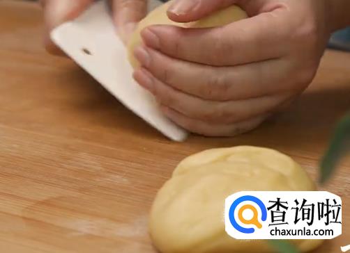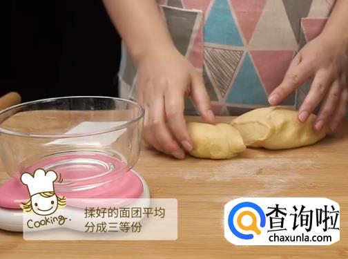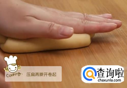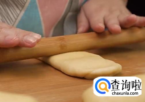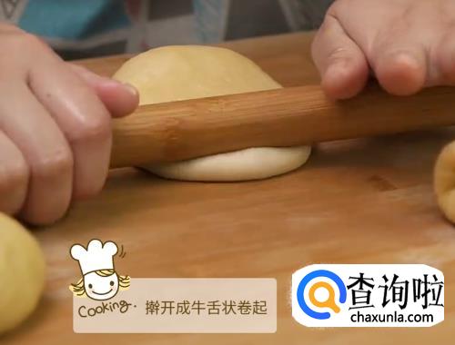 揉好的面团平均分成三等分,擀开成牛舌状卷起。