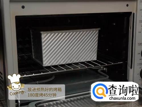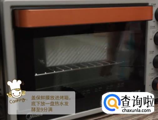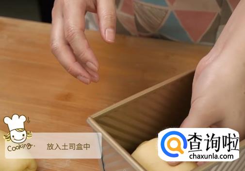 压扁再擀开卷起放入吐司盒子中,盖保鲜膜放进烤箱,底下放一盘子热水发酵至9分满。