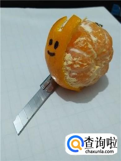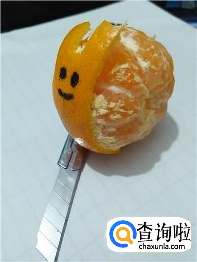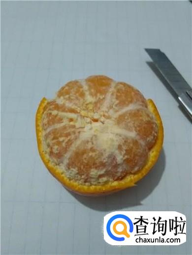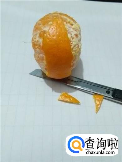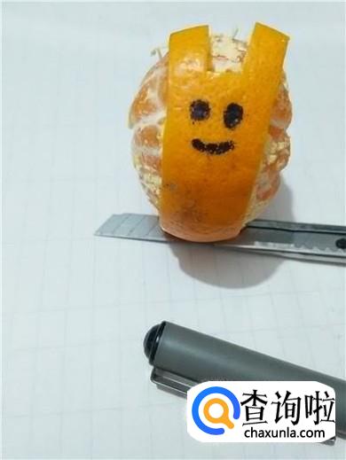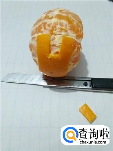 先用裁纸刀将桔子两侧刻掉,只留中间的多半圈桔子皮。