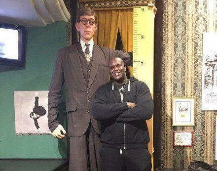 奥尼尔是NBA的内线巨无霸,身强体壮身高达到2米16,大多数人站在奥尼尔身边就像一个小孩,与奥尼尔沟通时也得仰望着他才行,不过山外有山人外有人,在与瓦德劳的蜡像合影时,奥尼尔甚至还到达不了他的肩膀,更不用说正常人和瓦德劳合影给人的震撼效果了。