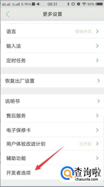 打开开发者模式后回到更多设置选项,把页面滑动到最下面可以看到有个开发者选项。点击打开。
