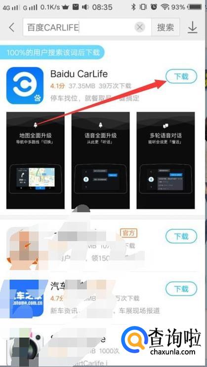接下来在手机下载百度CarLife软件。打开手机上的应用商城,在搜索软件栏输入:百度CarLife就可以搜索到软件,点击右侧的下载就会自动安装到手机。