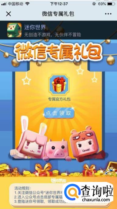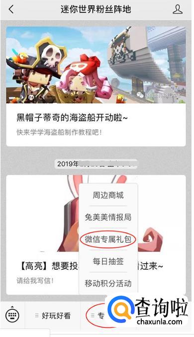 微信里搜索迷你世界粉丝阵地公众号,然后关注,进入公众号点击专属福利,选择微信专属礼包。
